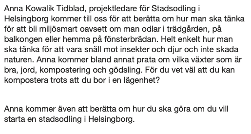 Denna onsdag, den 30 september, besöker Anna Kowalik Tidblad oss för att tala om miljösmart odling.