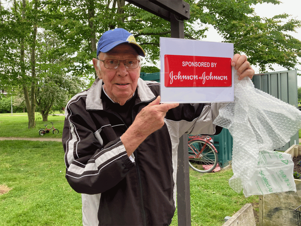 Det blev också smått jubel häromdagen, då Saul kom med ett ganska stort, brunt, fyrkantigt paket försett med etiketten ”GLAS” på sidorna, öppnade det – och plockade upp fina skyltar med loggan Johnson & Johnson, två av dem avsedda att ställa på ett bord eller liknande.