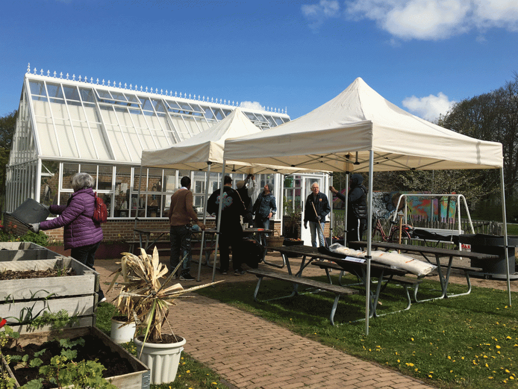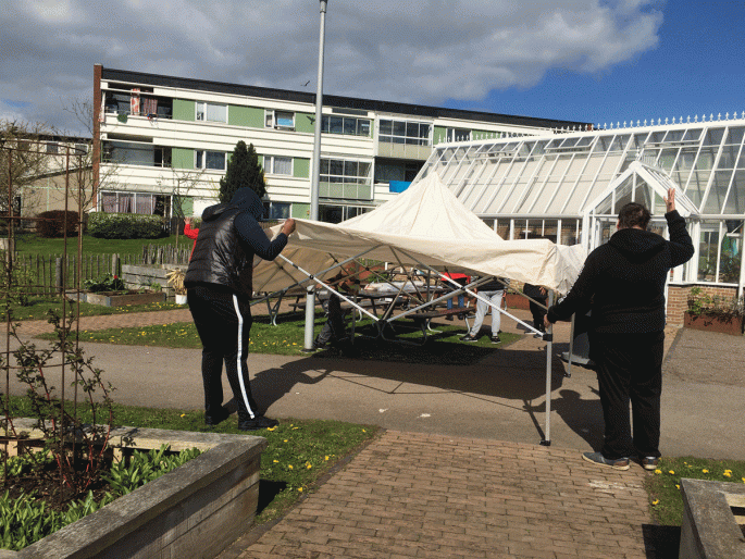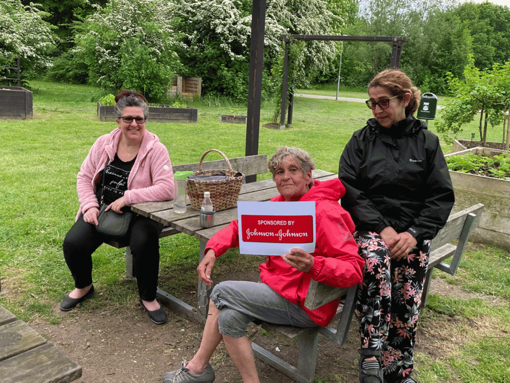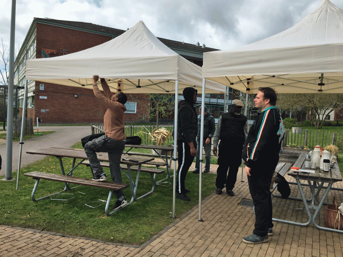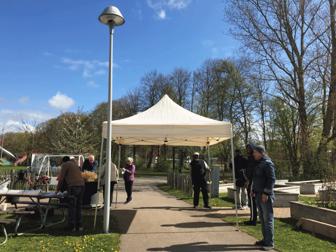 Vi blev sponsrade av Johnson & Johnson med fyra partytält á 3 x 3 meter. Så fantastiskt! Så bra! Nu kan vi samlas såväl när solen gassar hett som när det kommer regnskurar, och så trevligt när vi har nåt arrangemang med inhyrd musik, att de kan befinna sig i skydd för vädrets makter. Ja, vid alla sorters arrangemang förstås.