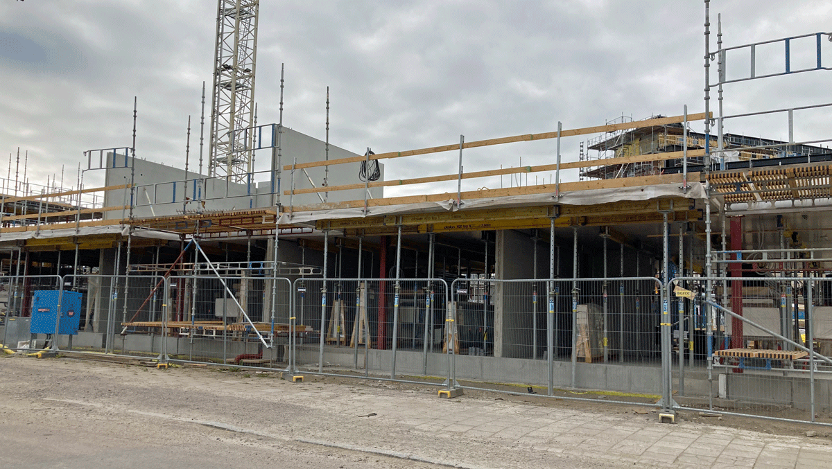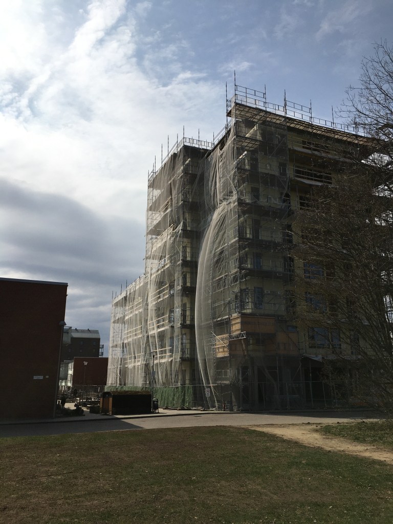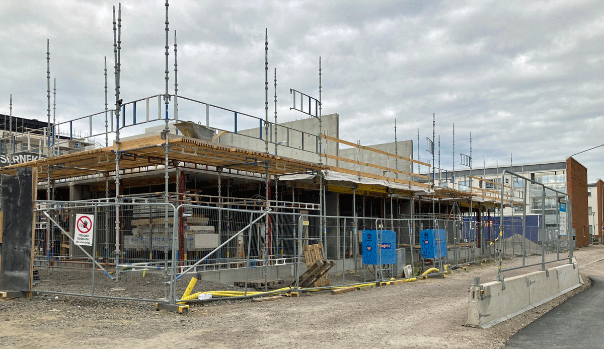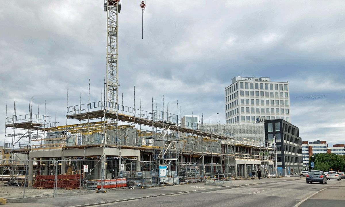 Den tornliknande delen i norr har nått sina åtta våningar, och i södra delen börjar husen med adress Regementsvägen 4 respektive Grönkullagatan 1 att resa sig upp över marknivå.