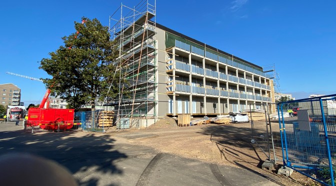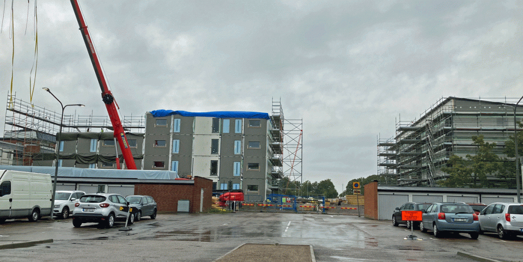Byggnaden till vänster är det som är nyast, och man ser tydligt hur det är uppbyggt av moduler. Den vänstra delen ser ut som om man travat arbetsbodar på varandra, medan den högra redan mer fått utseendet så som ett bostadshus ska se ut. Inte undra på, att man beräknar inflyttning redan till våren 2022, och allt är slutsålt.
