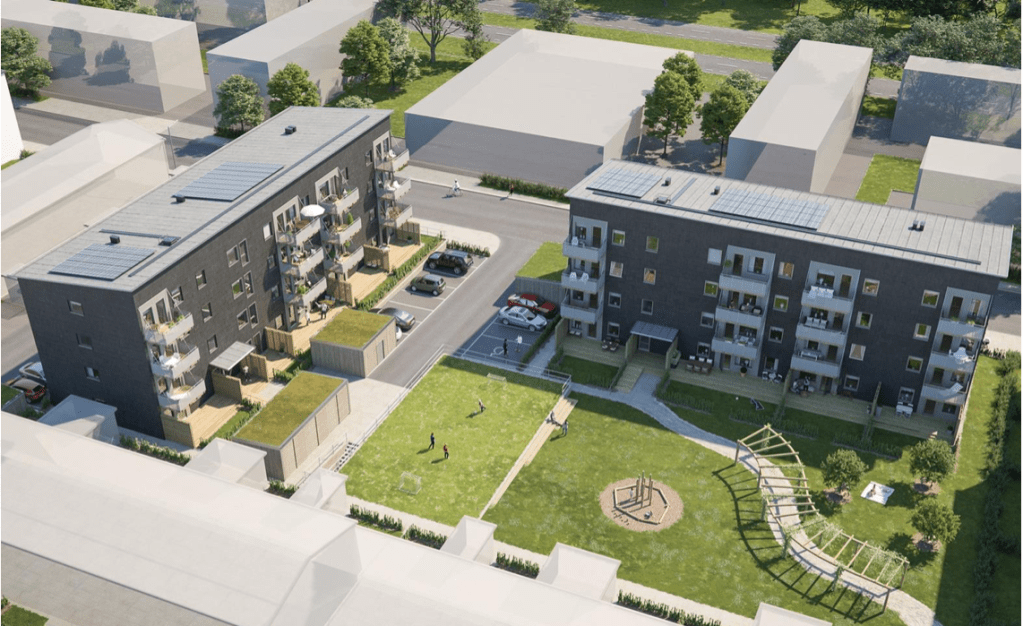 Här ser vi en bild på det ena fyravåningshuset med bostadsrättslägenheter från BoKlok som byggs för fullt på Grönkullagatan.