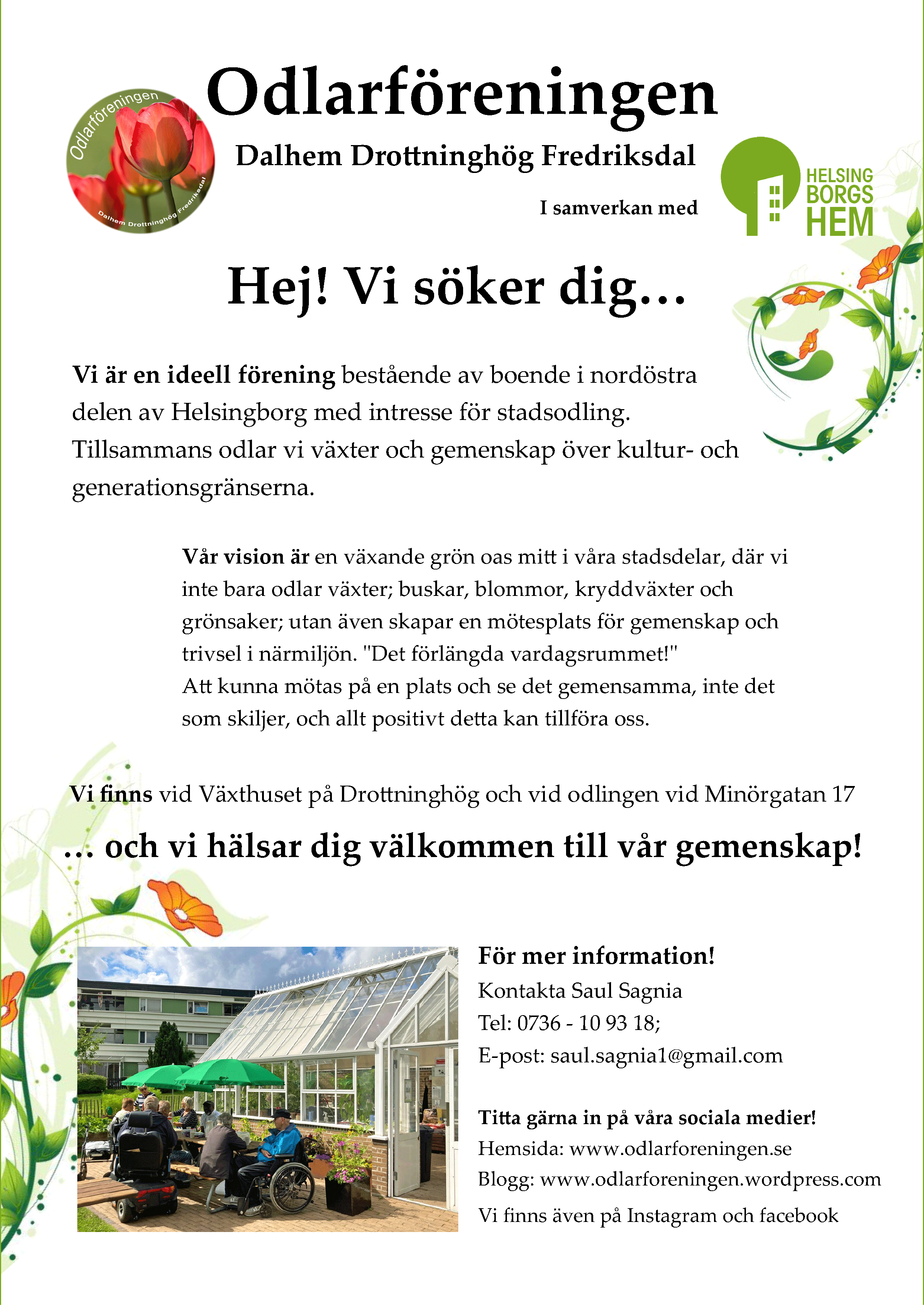 Det var dags att göra en ny blänkare, en affisch med lite lättsmält info som vi hoppas ska göra folk nyfikna på oss. Och det var tack vare Helsingborgshem som det blev gjort just nu. För de ska lägga in information om oss på sina kanaler. Såsom i de digitala trapphustavlorna.