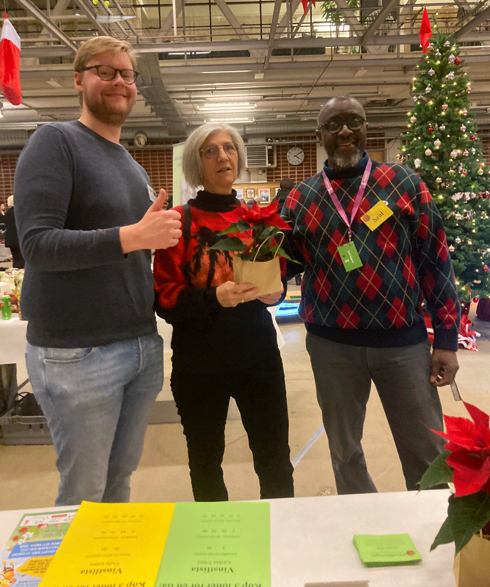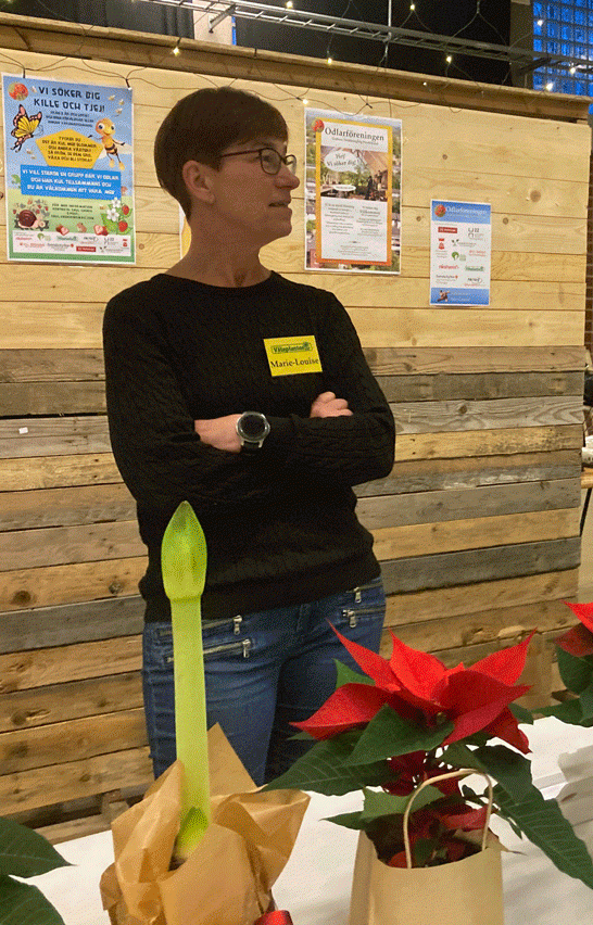 Bland annat hade hon skapat 22 blomsterarrangemang med anknytning till julen som lottades ut under eftermiddagstimmarna. Det var arrangemang med Amaryllis, Julstjärnor och Hyacinter i små söta pappkassar. Proffsigt gjort och fantasirikt att inte använda det gamla vanliga – traditionella röda krukor eller korgar, med eller utan tomtar.