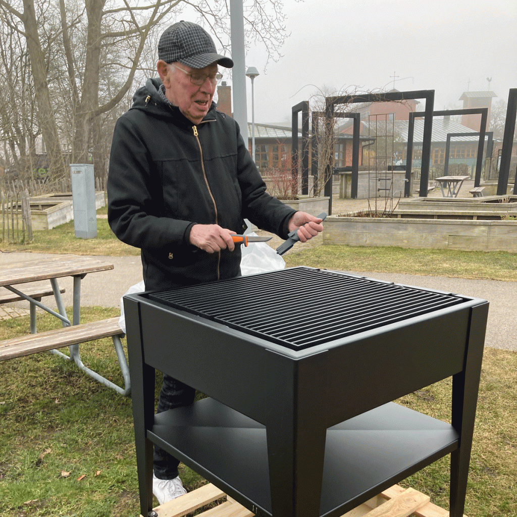 Tack vare Safegrowth och Stadsbyggnadsförvaltningen, finns nu möjligheten att flera kan grilla samtidigt när vi har våra arrangemang och sammankomster. Att vi valde en flyttbar istället för en stationär grill, beror på att vi vill kunna vara flexibla vid diverse arrangemang. En musiker, en musikgrupp, en magiker eller en föreläsare, ska fritt kunna röra sig framför Växthuset utan att vare sig grillen eller grillande människor är i vägen.