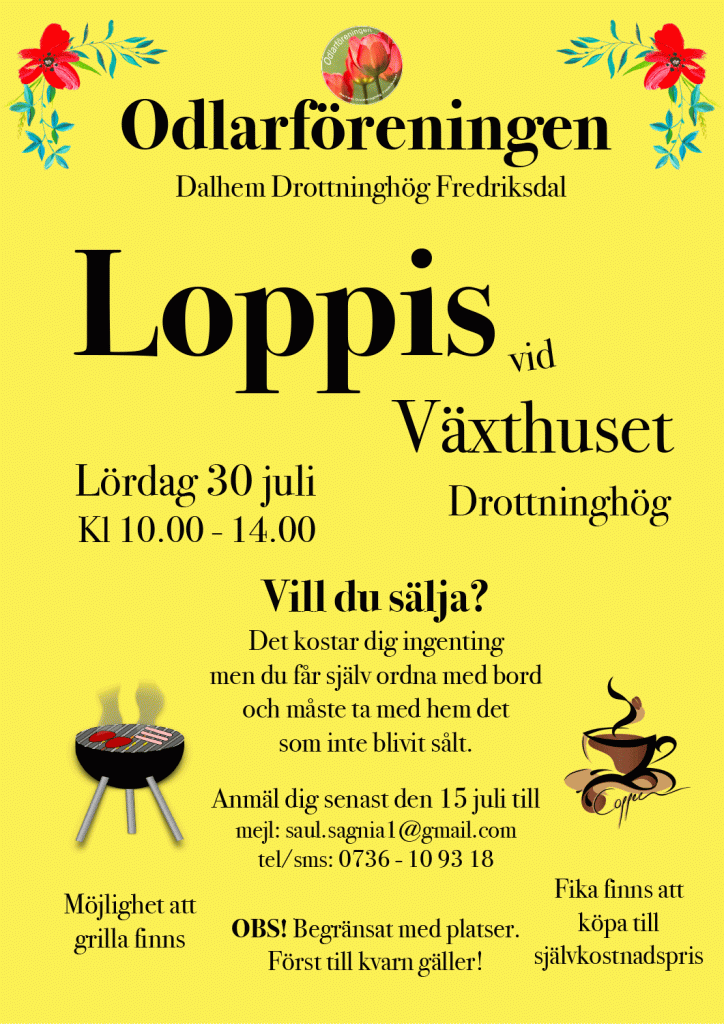 Hej loppis-säljare! Till och med söndag den 24 juli, går det bra att anmäla sig till vårt sommarloppis vid växthuset på Drottninghög.