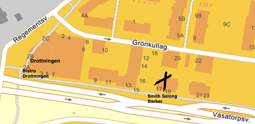 Till höger om Drottningen sträcker sig alltså Vasatorpsvägen österut, och bara en liten bit bort, ungefär halvvägs bort mot horisonten, ligger de 4 kvadratiska fastigheterna byggda av Tornet, och där – i nummer 17 – finns alltså denne fantastiskt skicklige frisör.