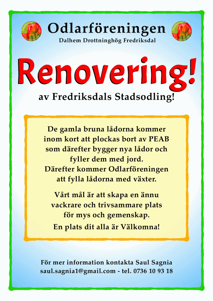 #odlarforeningen_hbg, Fredriksdals odling, Information, StadsodlingFredriksdals stadsodling får en behövlig make-up! maj 7, 2024 odlarforeningen Dela detta: Dela på X (Öppnas i ett nytt fönster) X Dela på Facebook (Öppnas i ett nytt fönster) Facebook Dela på LinkedIn (Öppnas i ett nytt fönster) LinkedIn E-posta en länk till en vän (Öppnas i ett nytt fönster) E-post Gilla Laddar in … Relaterade Publicerad av odlarforeningen Visa alla inlägg av odlarforeningen