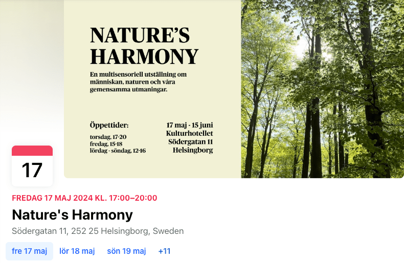 Nature’s Harmony är en multidisciplinär utställning där besökaren ”slängs” in i naturens ekosystem och ljudlandskap genom olika konstnärliga uttryck. Med de olika konstnärliga uttrycken utforskar utställningen den komplexa relationen mellan mänskligheten och naturen samt utmaningarna för hållbar utveckling i våra dagliga liv. Syftet är att inspirera besökare att agera för en mer hållbar framtid och reflektera över hållbara lösningar för både människor och natur samtidigt som de kan känna, höra och interagera med naturen. Kom och upplev naturen som du aldrig tidigare gjort. Fri entré.