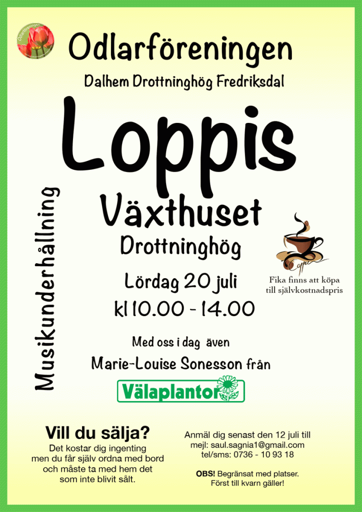 #odlarforeningen_hbg, #valaplantor, Arrangemang, LoppisÄntligen loppis på Drottninghög! juli 6, 2024 odlarforeningen Dela detta: Dela på X (Öppnas i ett nytt fönster) X Dela på Facebook (Öppnas i ett nytt fönster) Facebook Dela på LinkedIn (Öppnas i ett nytt fönster) LinkedIn E-posta en länk till en vän (Öppnas i ett nytt fönster) E-post Gilla Laddar in … Relaterade Publicerad av odlarforeningen Visa alla inlägg av odlarforeningen